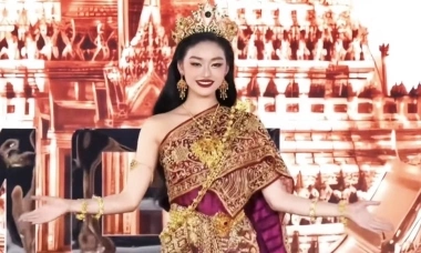 Hoa hậu Yến Nhi diện trang phục truyền thống nhiều sắc màu của phụ nữ Thái Lan tại họp báo Miss Grand International 2025.