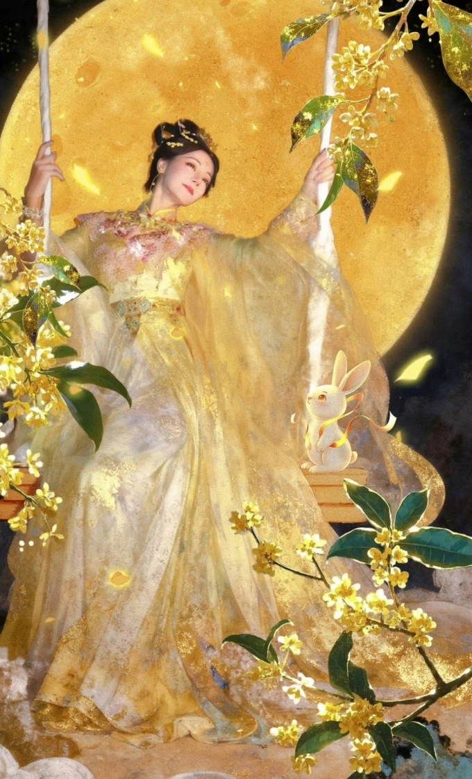 Diễn viên Trung Quốc Địch Lệ Nhiệt Ba diễn điệu múa tiên nữ rải hoa trên cung trăng, dịp Trung thu.